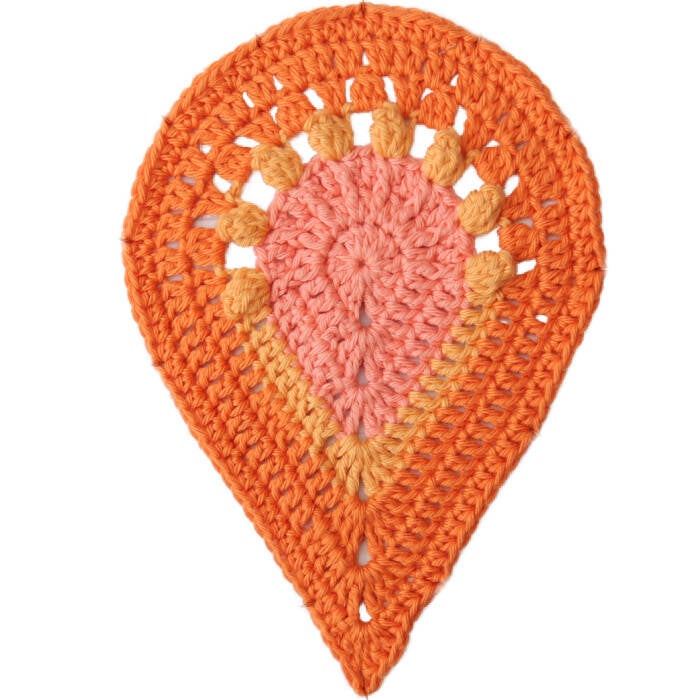 Ronde 4: Hecht aan met een staand stk in de 1L hoekruimte. [Stk, Dstk, 1L, Dstk, 2 Stk] in dezelfde 1L ruimte. Stk in de vlg 10 stn. (Maak een Popcorn in de vlg st, dit is in het Rstkv. 3l, sla vlg 2 stn over) 7 maal. Maak een Popcorn in de vlg st, 1L. Stk in de vlg 9 stn. Sluit met HV in stand stokje. Knip draad af en werk draadjes weg. {23 stk, 8 Popcorns, 2 Dstk, 7 3L ruimtes, en 1L ruimte. 1L van hoekruimte niet meegerekend} Kleurwissel