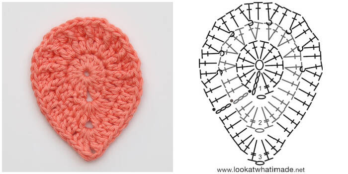 Ronde 1: Maak een magische ring, In de ring, 5L (staat voor Dstk en 1L), Dstk, 12 stk. Sluit met hv in 4e L van begin 5L {12 Stk en 2 Dstk – 1L niet meegerekend}