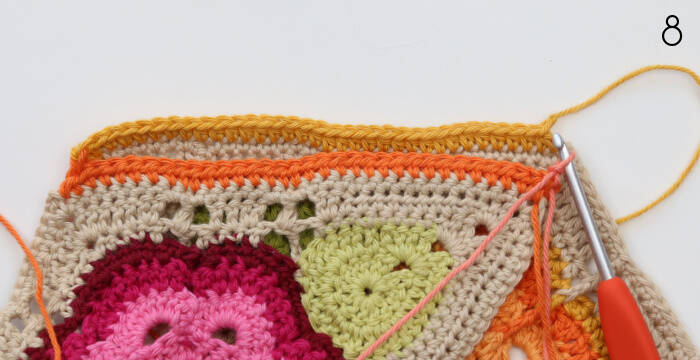 Haak 2 hstksam in de eerste 2 stn na de 2L hoekruimte {foto 5}. Hstk in de vlg 30 stn. 2 hstk in de 2L hoekruimte op de punt van het blad {foto’s 6 en 7}.