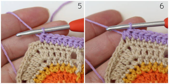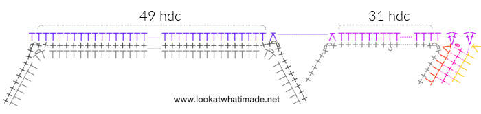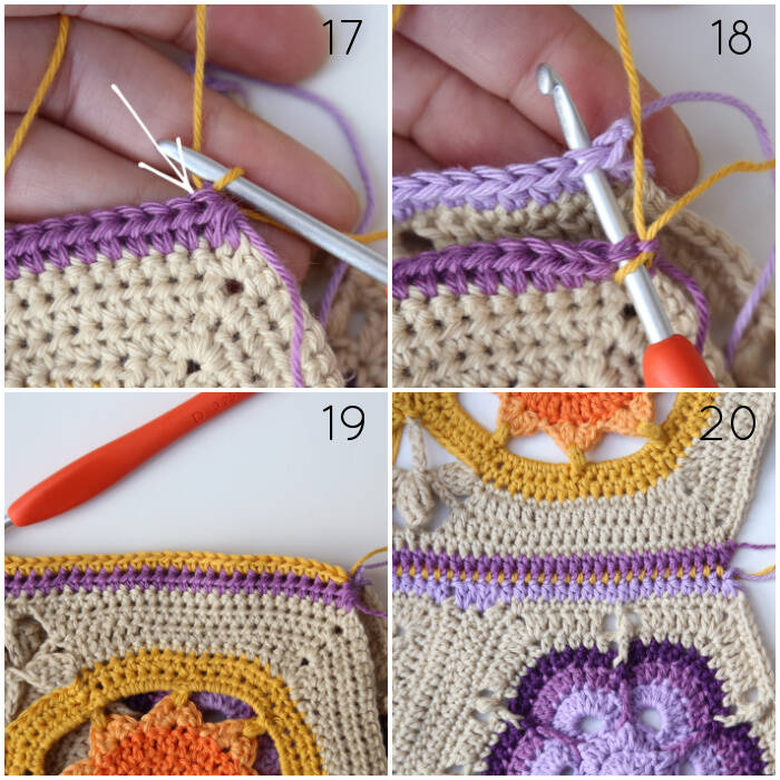 1L. Steek je haaknaald in de eerste st van de bovenste strook (brede strook) en de tweede st van de onderste/smalle strook {foto 18}. Haak een v. Werk door beide stroken in de steken en haak een V in de vlg 357 stn. foto 19 showt de v stn, foto 20 showt de stroken verbonden aan goede kant. Knip draad af, en werk draadeindes weg. {358 v}