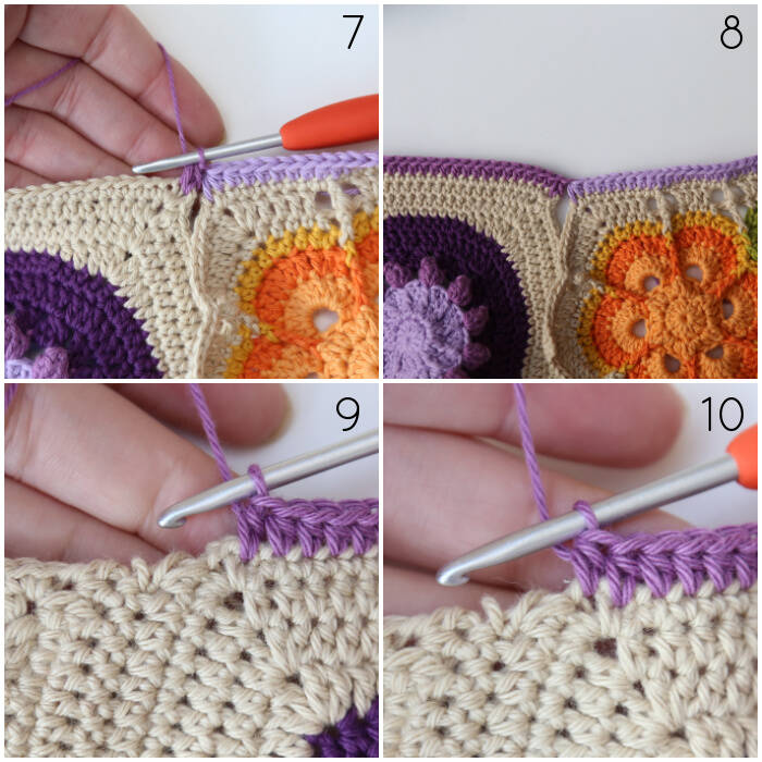 Dit doe je in totaal viermaal, zodat alle stroken aan elkaar verbonden zijn. De techniek is hetzelfde, als bij het verbinden van alle motieven aan elkaar, alleen nu met veel meer steken.