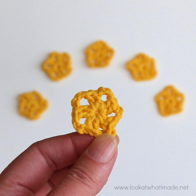 Kleur A: Maak een magische ring: 3L (telt als eerste st), st, 3L. (2 st, 3L) 4 maal. Sluit je magische ring, en sluit de ronde met een HV in de top van je begin 3L. Hecht af, en werk draadjes weg.