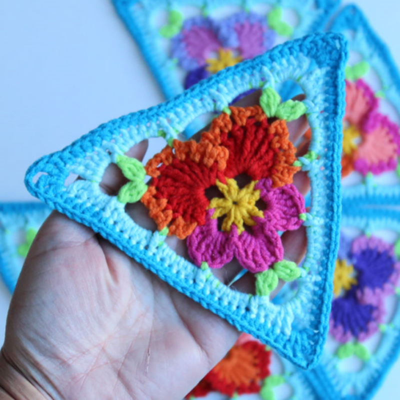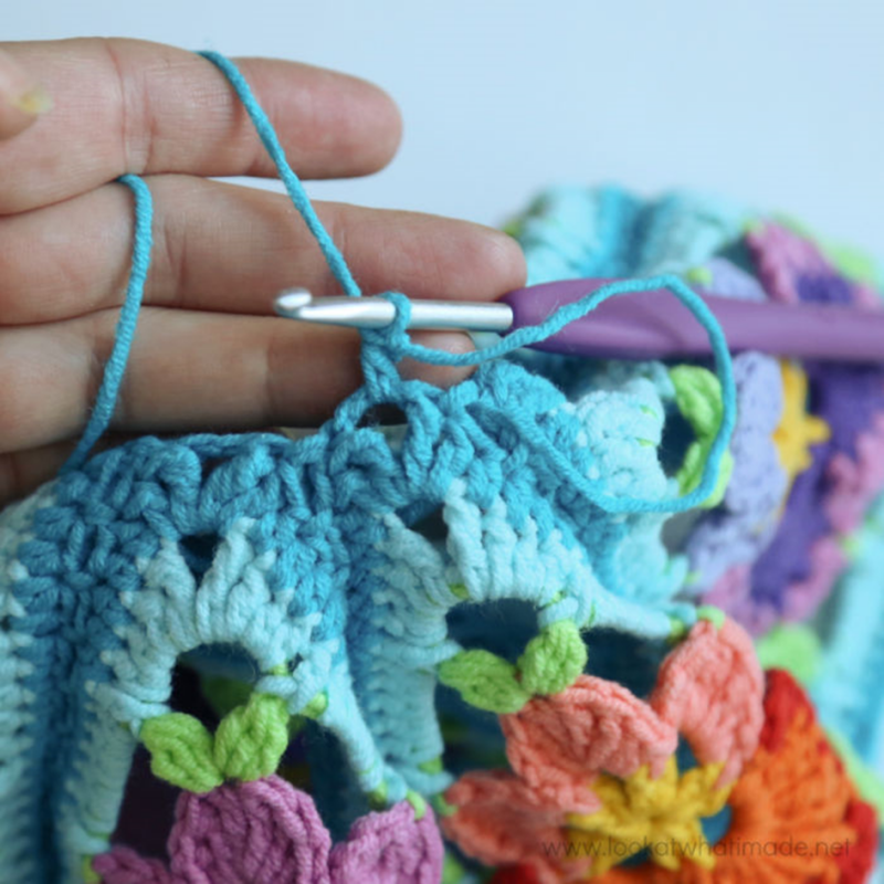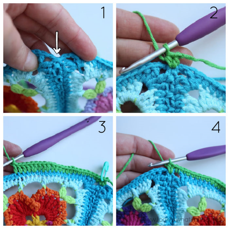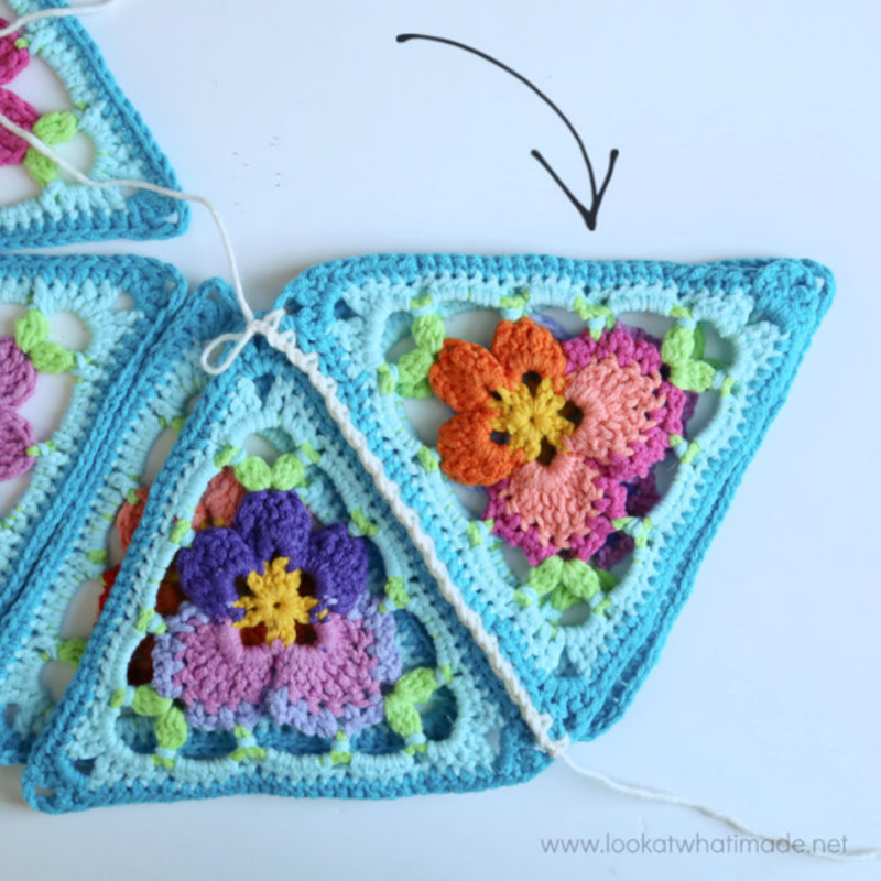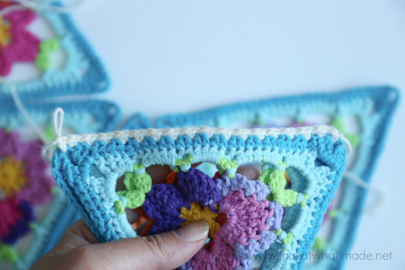 Met een willekeurige kleur en dezelfde maat haaknaald als die je gebruikte bij het maken van de driehoeken: