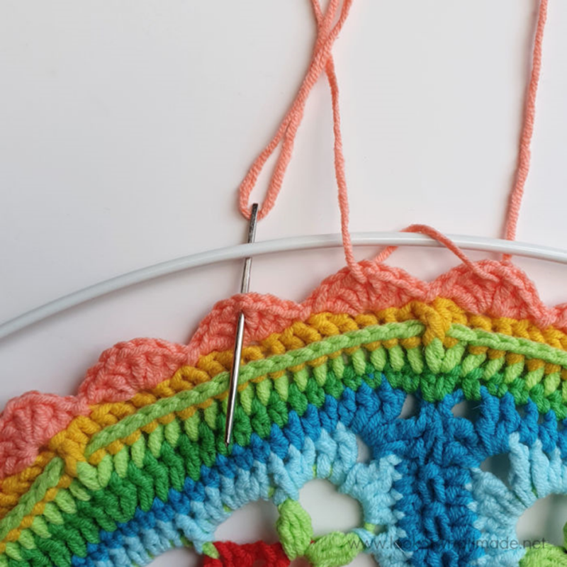Rijg vervolgens het garen door elke 1L rm van de boogjes rondom, om de mandala vast te zetten, op de volgende manier: