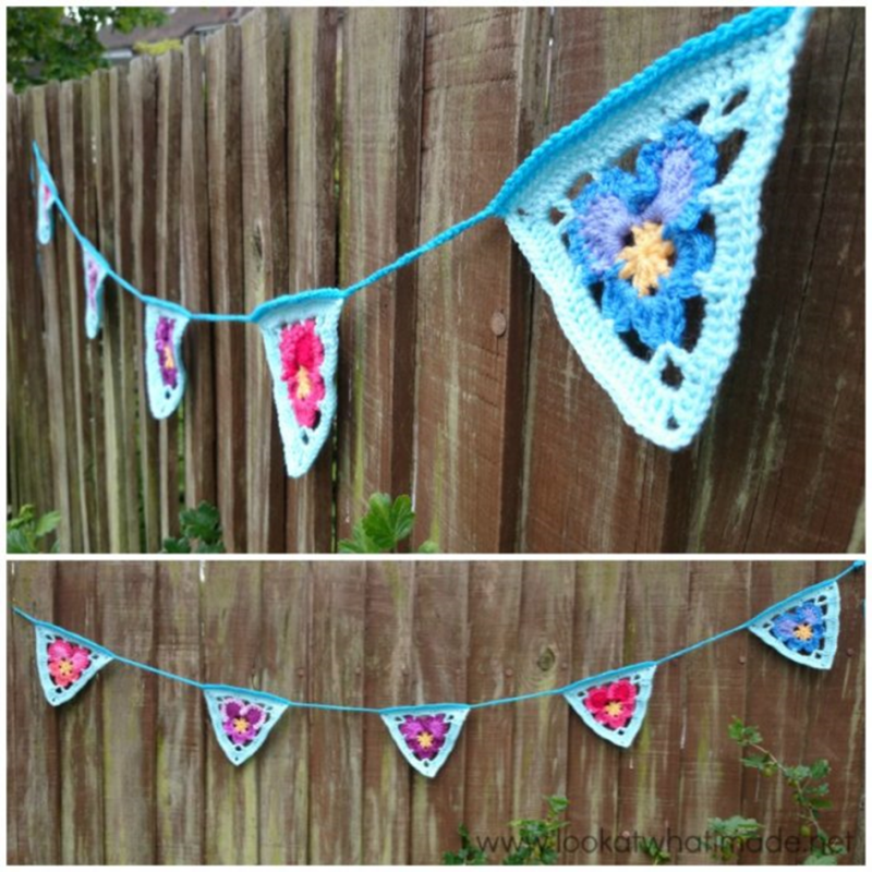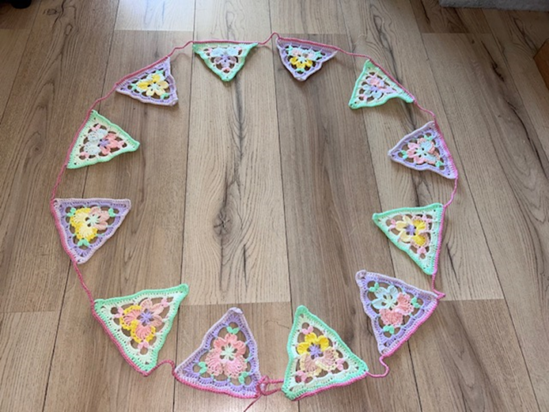 Je kan nu verder gaan met het patroon van Panzy’s Pizza om de mandala te maken, of je kiest er nu voor om de driehoeken tot slinger te gaan omtoveren.