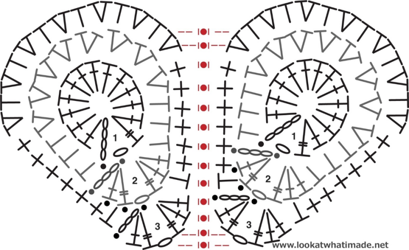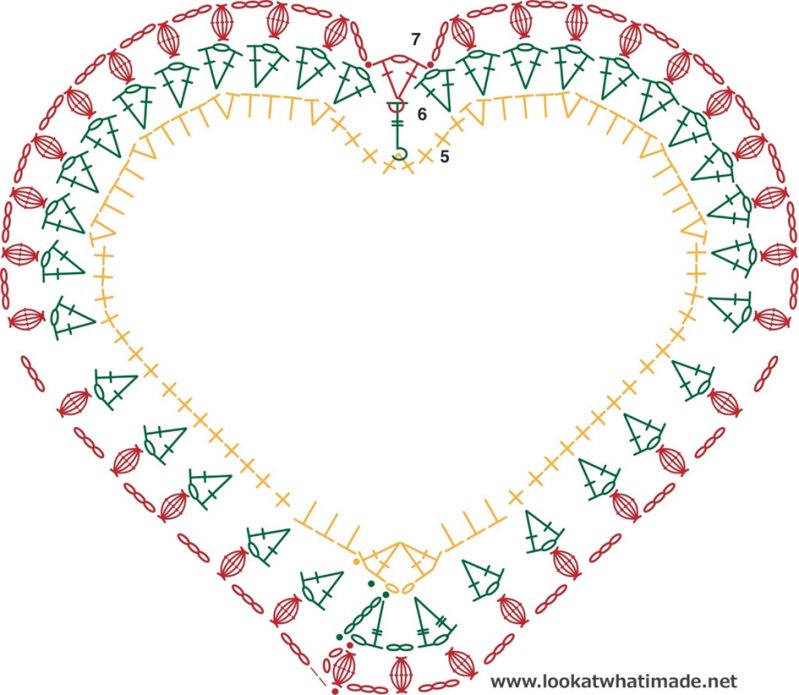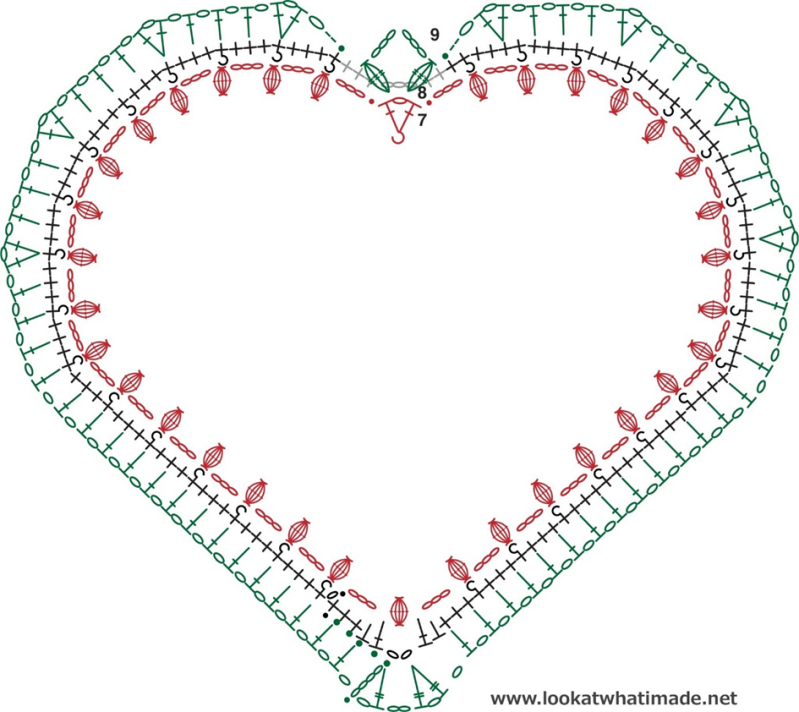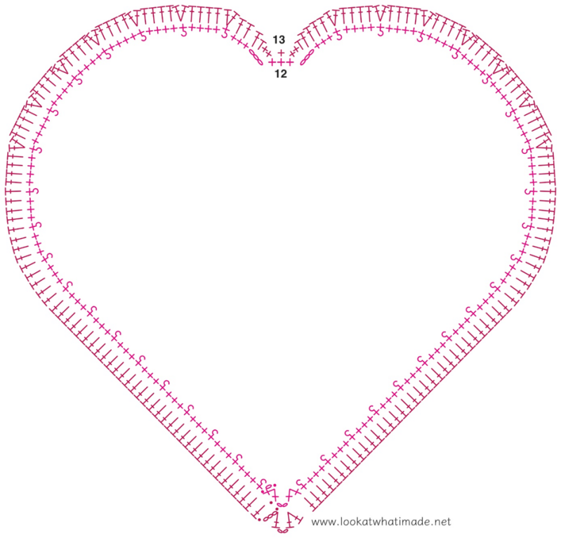 - Als je een nieuwe kleur gebruikt, Hecht aan met een staand dstk in de 2L rm in het puntige eind van het hart. [1L, Dstk] in dezelfde 2L rm. Dit is je eerste Dstk-V.