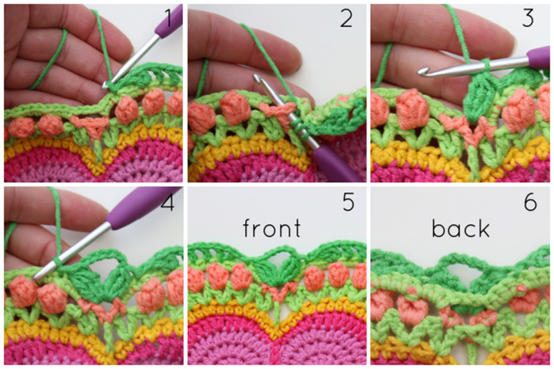 Werk Voor de 6L rm van ronde 9, Ddstk in de 3L rm van ronde 8 (tussen en achter de blaadjes). Je zult een beetje moeten spitten om de 3L rm te vinden {foto 1}. (1L, Ddstk in dezelfde 3L rm) 5 maal {foto 2}.